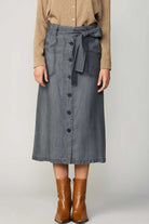 - BLACK WASHED FRONT BUTTON DOWN SKIRT WITH SELF BELT AND SIDE UTILITY POCKET & SIDE PLEATED DETAIL