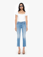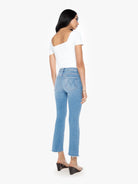 Rise and shine. This iconic high-waisted bootcut hits at the ankle with a frayed step-hem. Made from stretch denim, Beaming is a light blue with whiskering and fading at the knees.