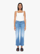 Mid-rise jeans with a wide straight leg, zip fly and clean ankle-length inseam. Made from stretch denim, Out Of The Blue is mid blue with whiskering and fading at the knee.