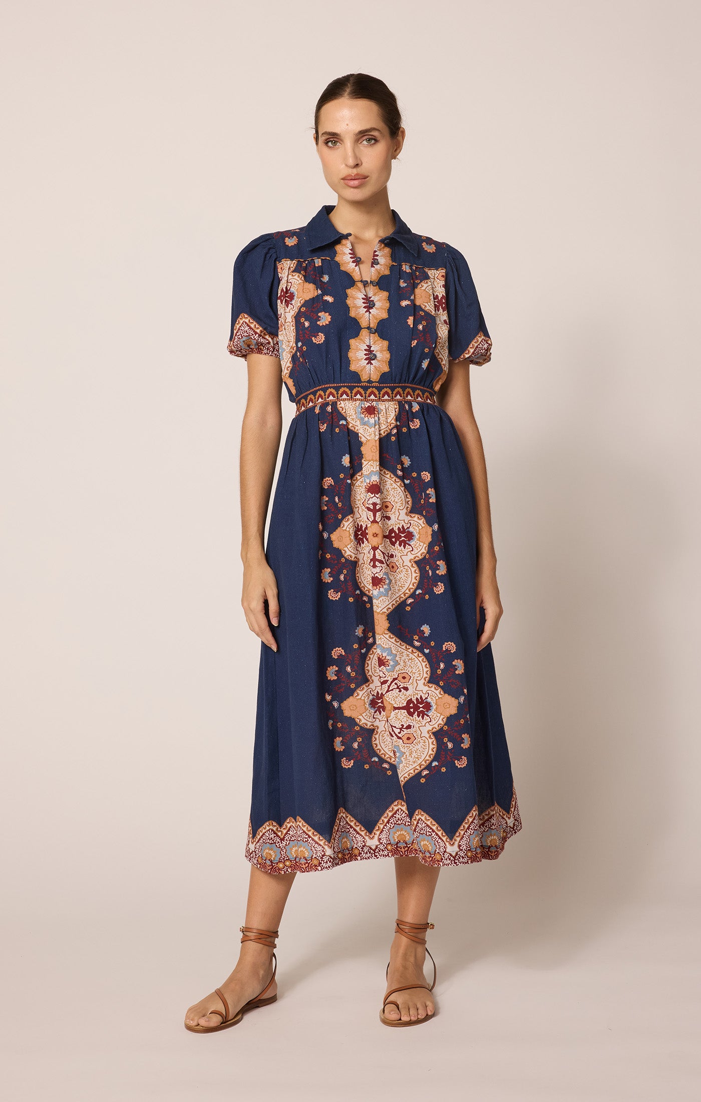Ethically handmade in India from 70% cotton 30% linen, the Asha Midi Dress is an update to our best-selling Leigh Mini Dress. Elegant and chic, this dress features a novelty yoke detail and buttons at the bodice with a collar neckline. Short sleeve with an elastic waist band at the back, this dress is ideal for any occasion. Dress up with a pair of strappy heels or dress down with flats.