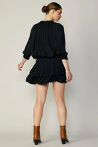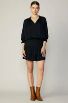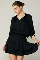 All hail the little pleated dress. It's chic yet absolutely effortless, done here with three-quarter sleeves and elevated by a tie neck, ruffle trim, and a shape-enhancing elastic waist that leads to a fluttery tiered hem. Pair it with heels for nighttime or with flats during the day.
