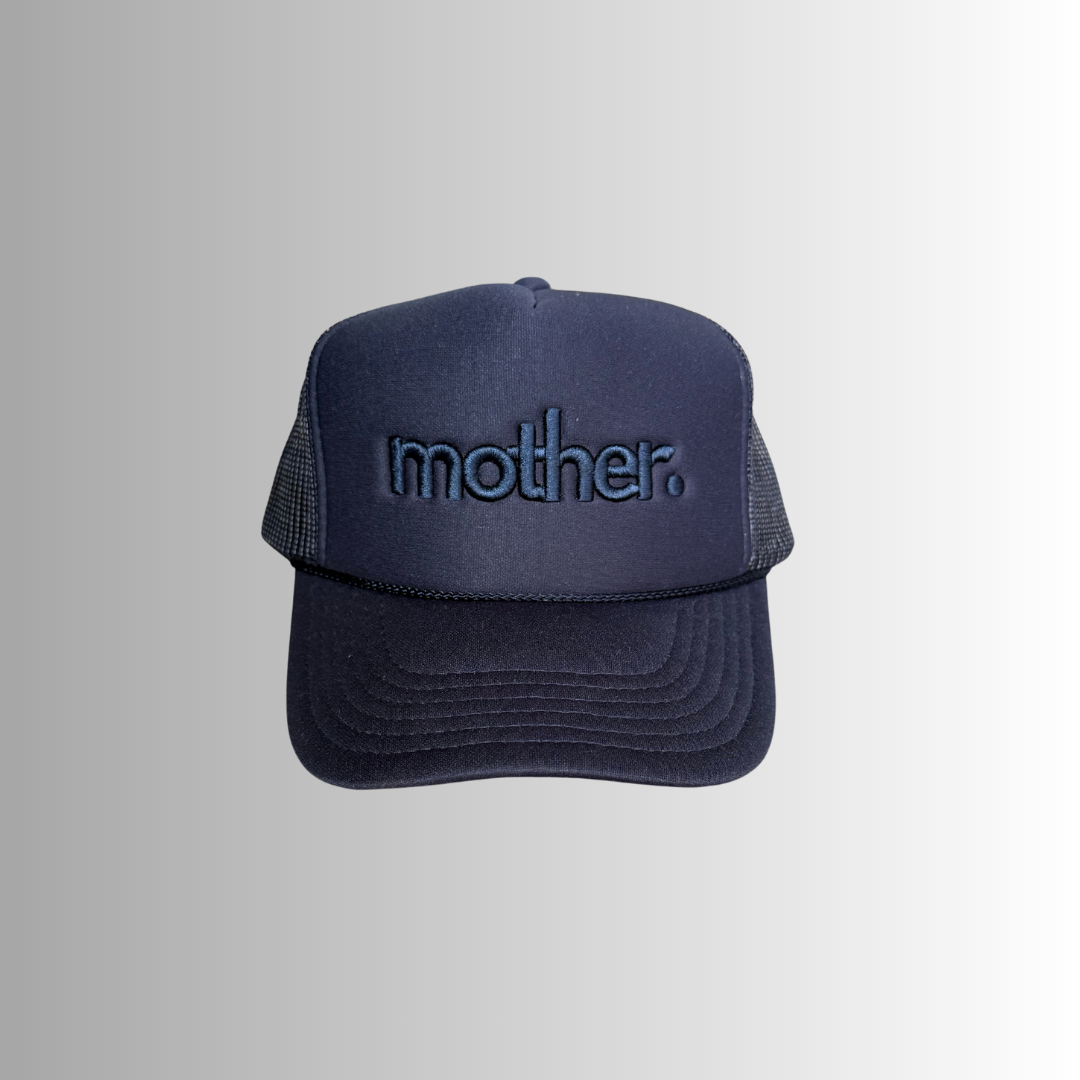 The elevated version of your everyday hat. "mother." is embroidered across our Navy trucker hat with matching thread. Wear this hat as a reminder of your strength. Features: * High profile, structured * Color: Navy * "mother." in puff embroidery * Slightly curved visor * Foam trucker with nylon mesh back * Plastic snapback