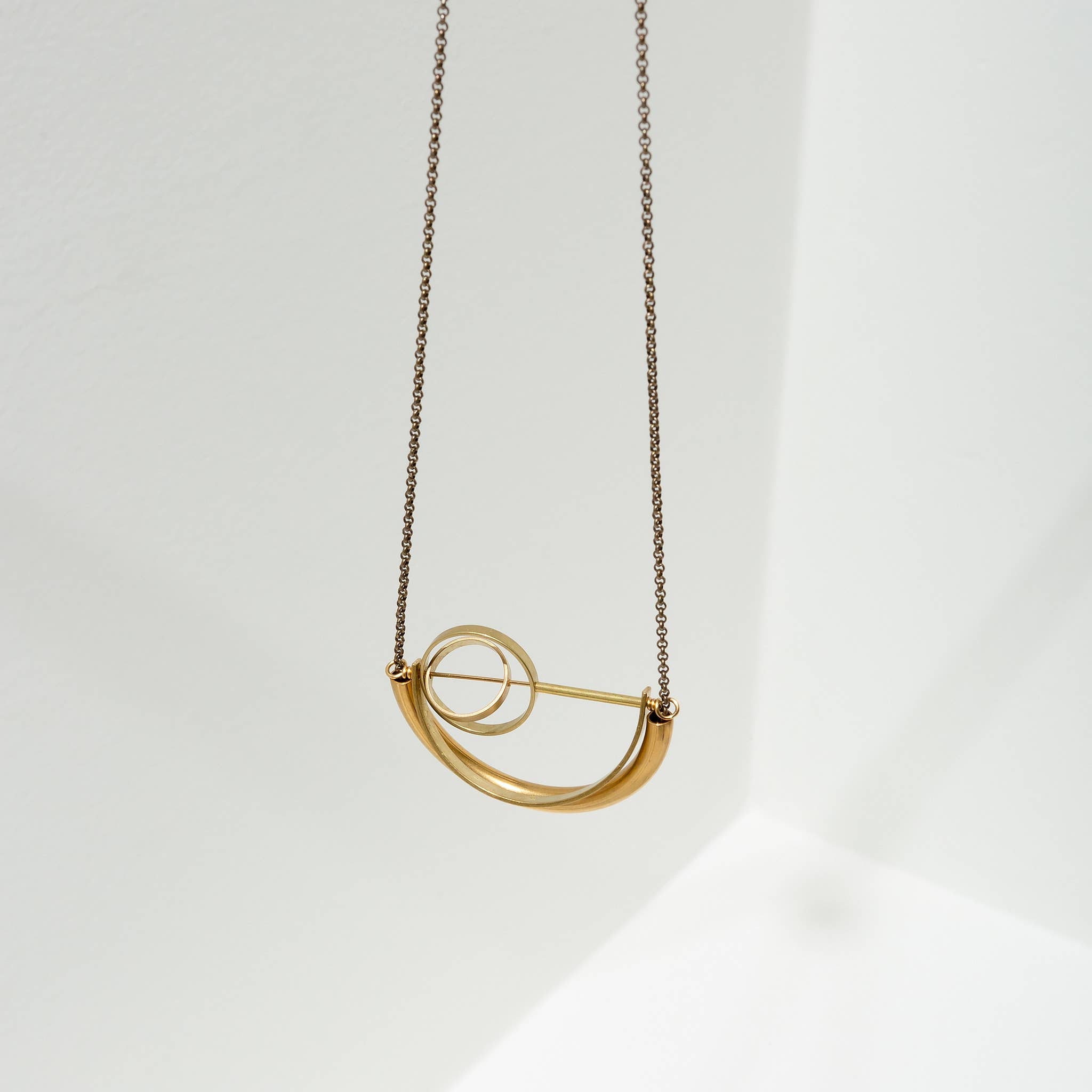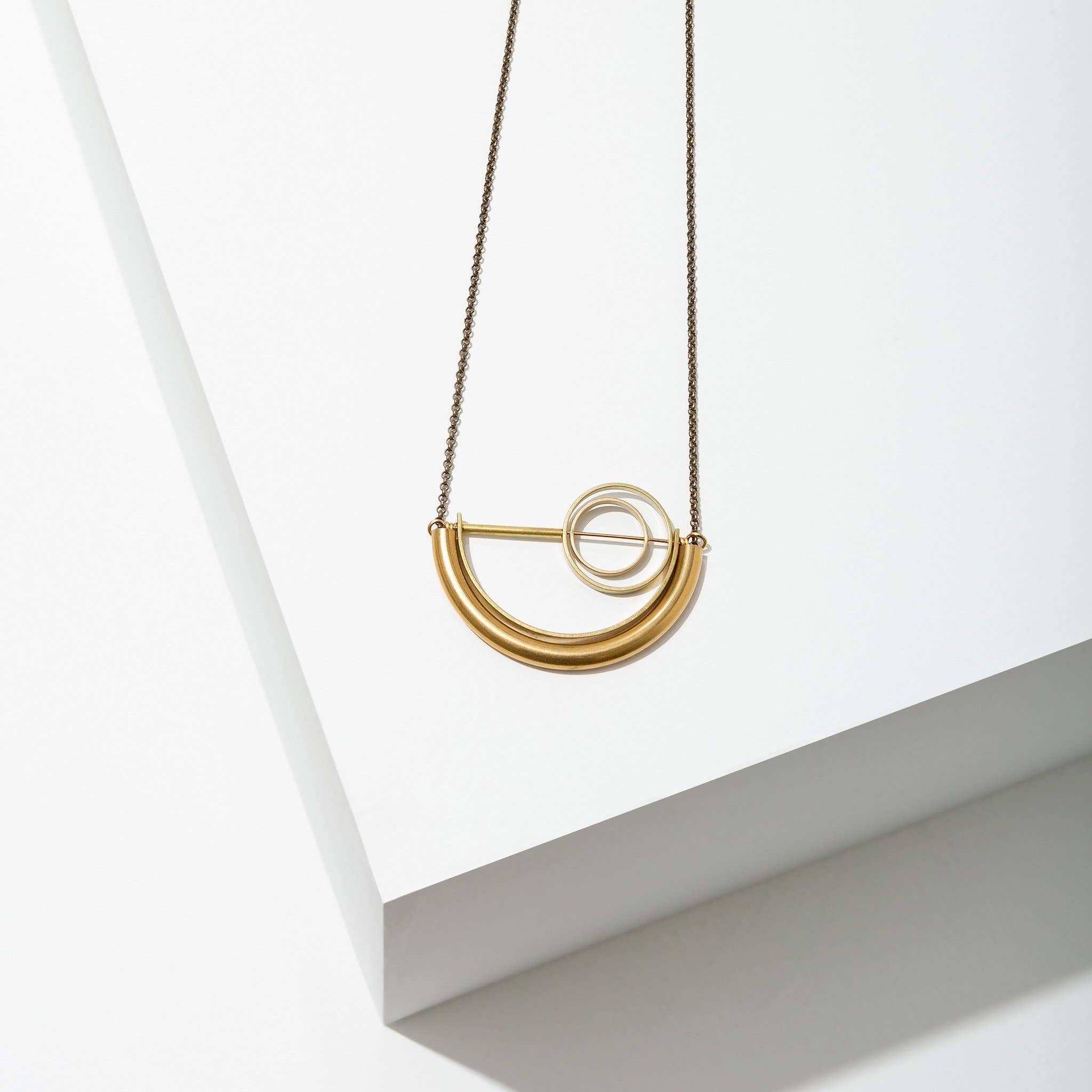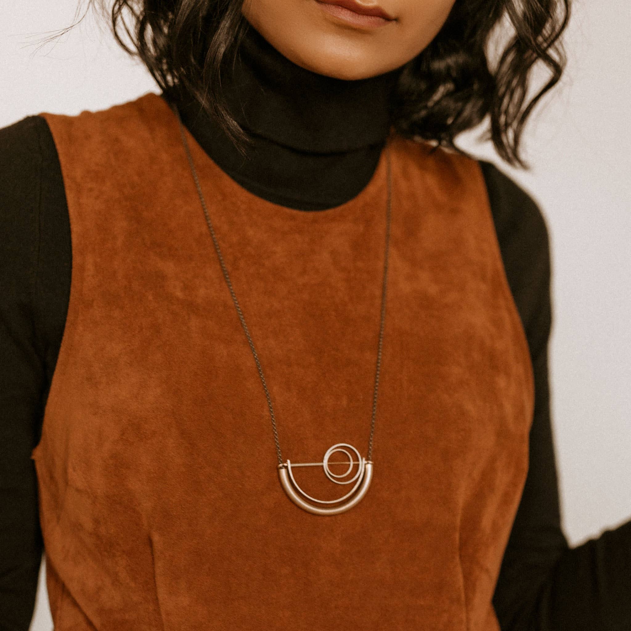 Meet your better half, your tried and true, the peanut butter to your jelly. The Alden Necklace features brass concentric circles suspended in a half-circle shape on an antiqued brass chain. It's 30" long, and pairs just as well with a sundress as it does with a chunky sweater.