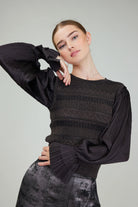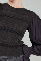 Threaded with metallic accents for a subtle glimmer, this crewneck top has a richly textured sweater bodice framed by pleated woven sleeves. Tiered ruffle cuffs complete the look.