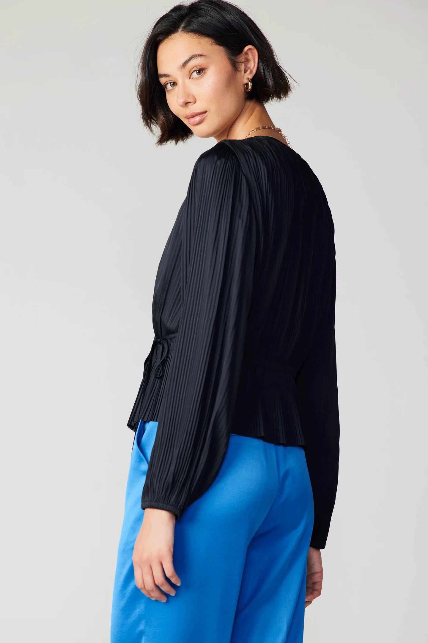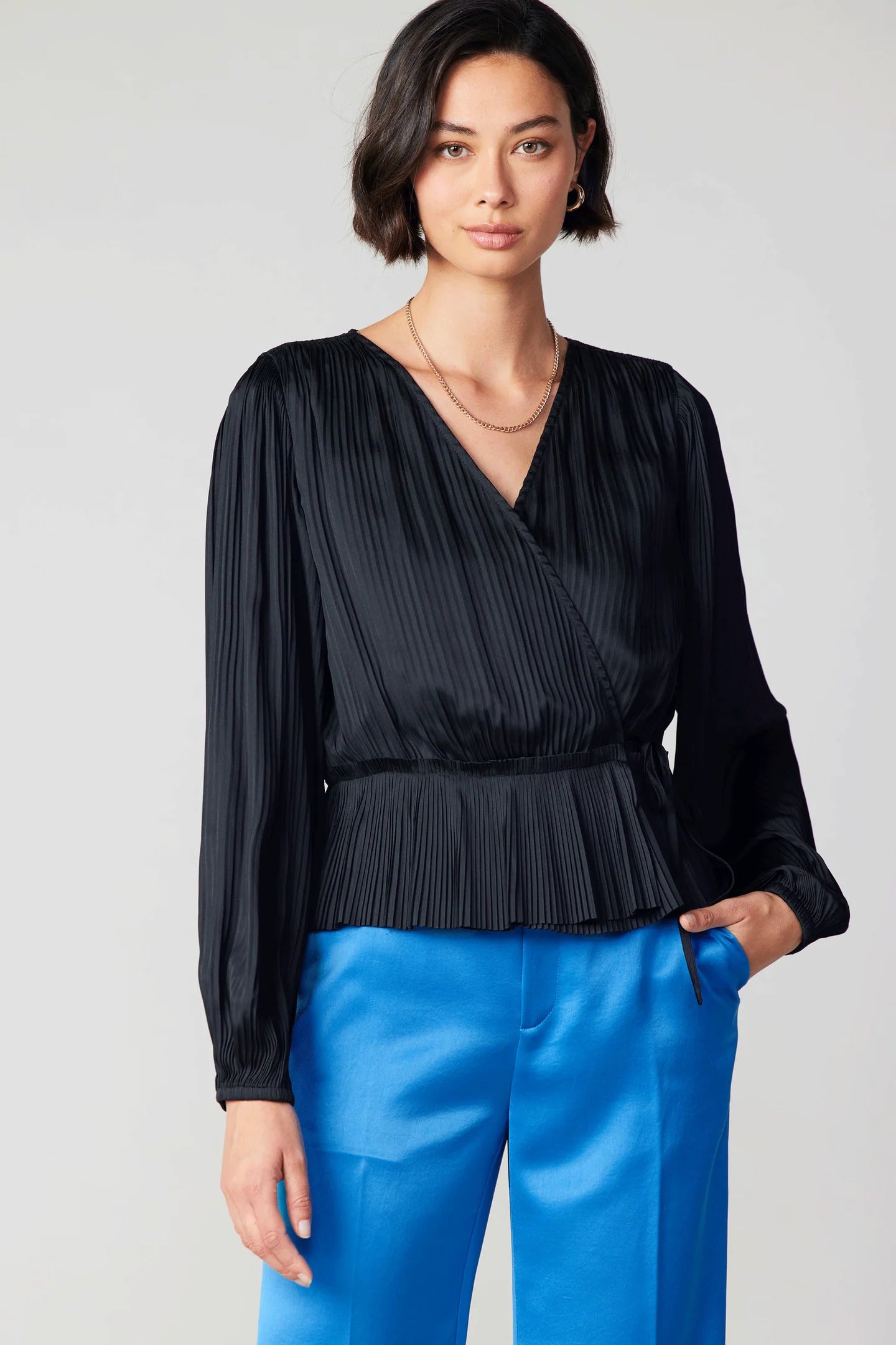 This lustrous wrap top ties at the side and has hundreds of tiny pleats that create an incredibly cool texture. It's complete with long sleeves and a shape-enhancing peplum.