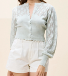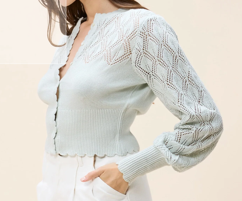 The Roksi Sweater is a beautifully crafted layering essential made from soft organic cotton yarn. This long-sleeve button-down silhouette features an intricate pointelle stitch throughout, adding texture and feminine detail to its timeless design. With delicate scalloping and a flattering, slightly cropped fit, the Roksi brings effortless elegance to both casual and elevated looks.