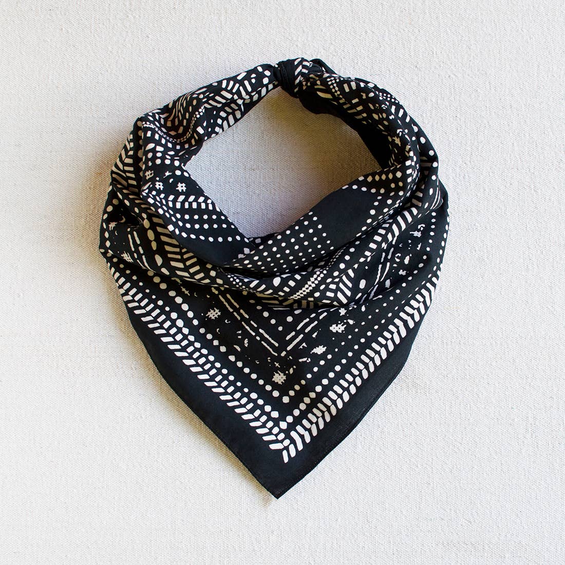 Dots and dashes are printed in bone white ink on this geometric scarf. Perfect for wearing while dashing around city streets on your bike or as a pocket accessory.