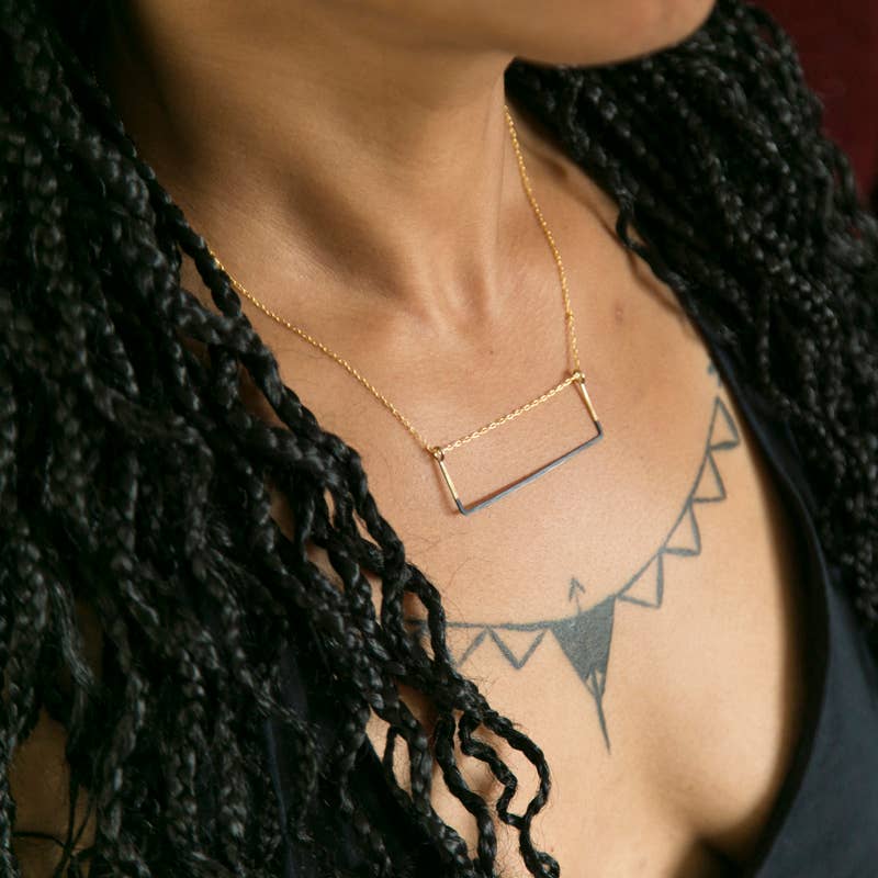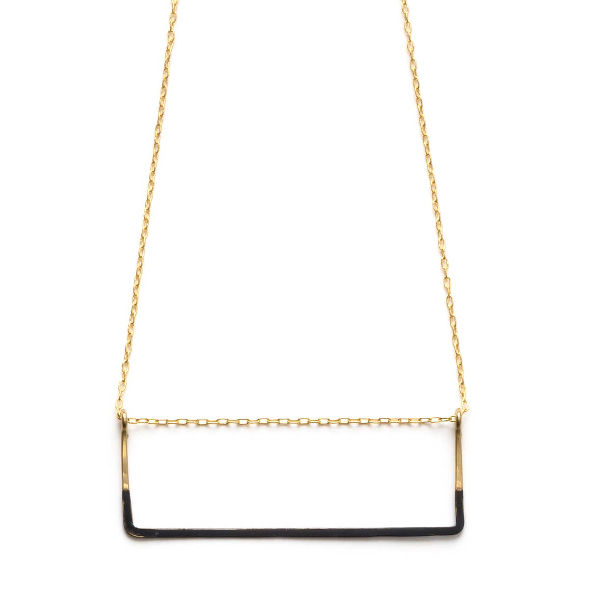 Patina Dipped Rectangle Necklace is made of partially oxidized brass, hangs on 18" gold plated chain.