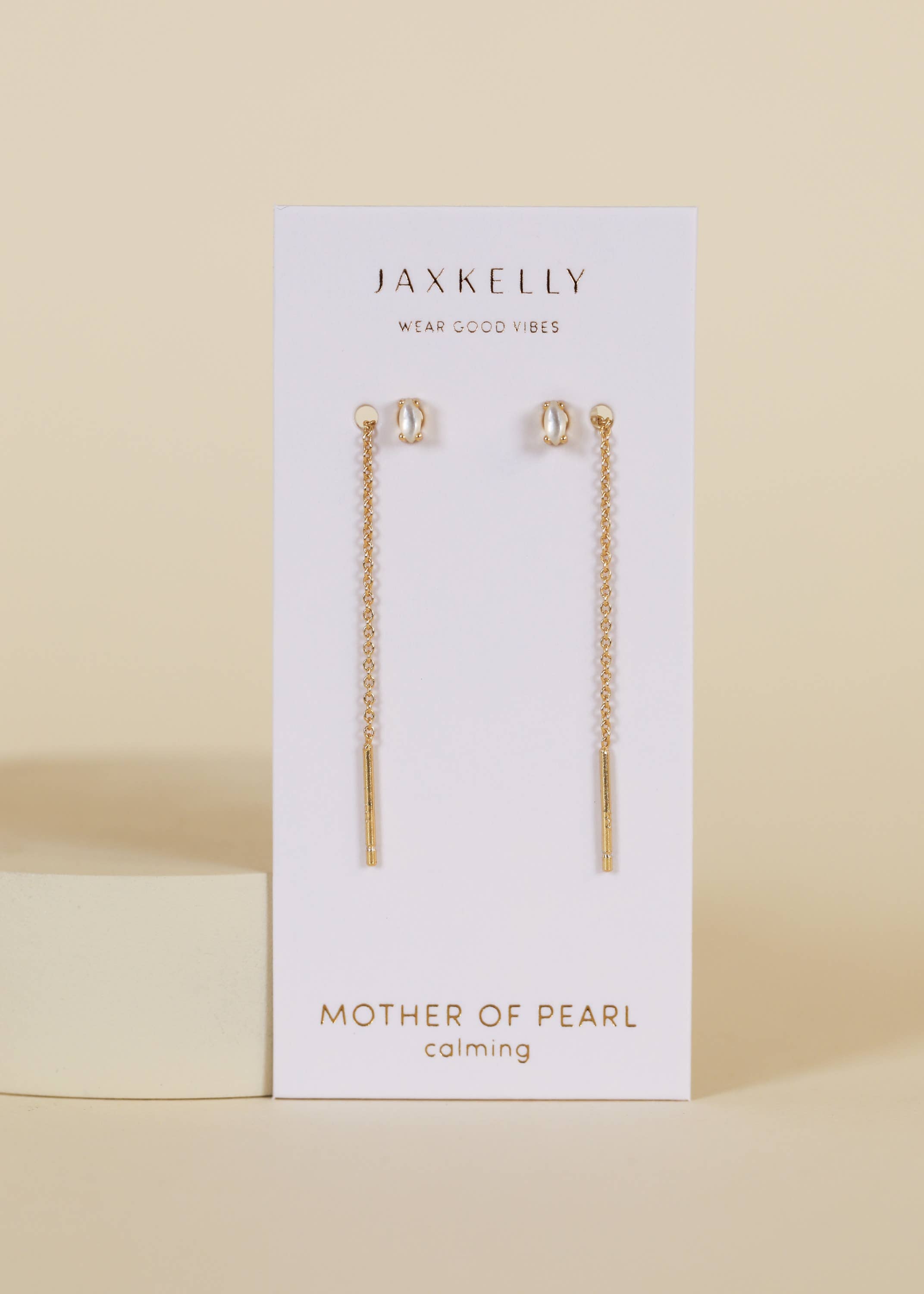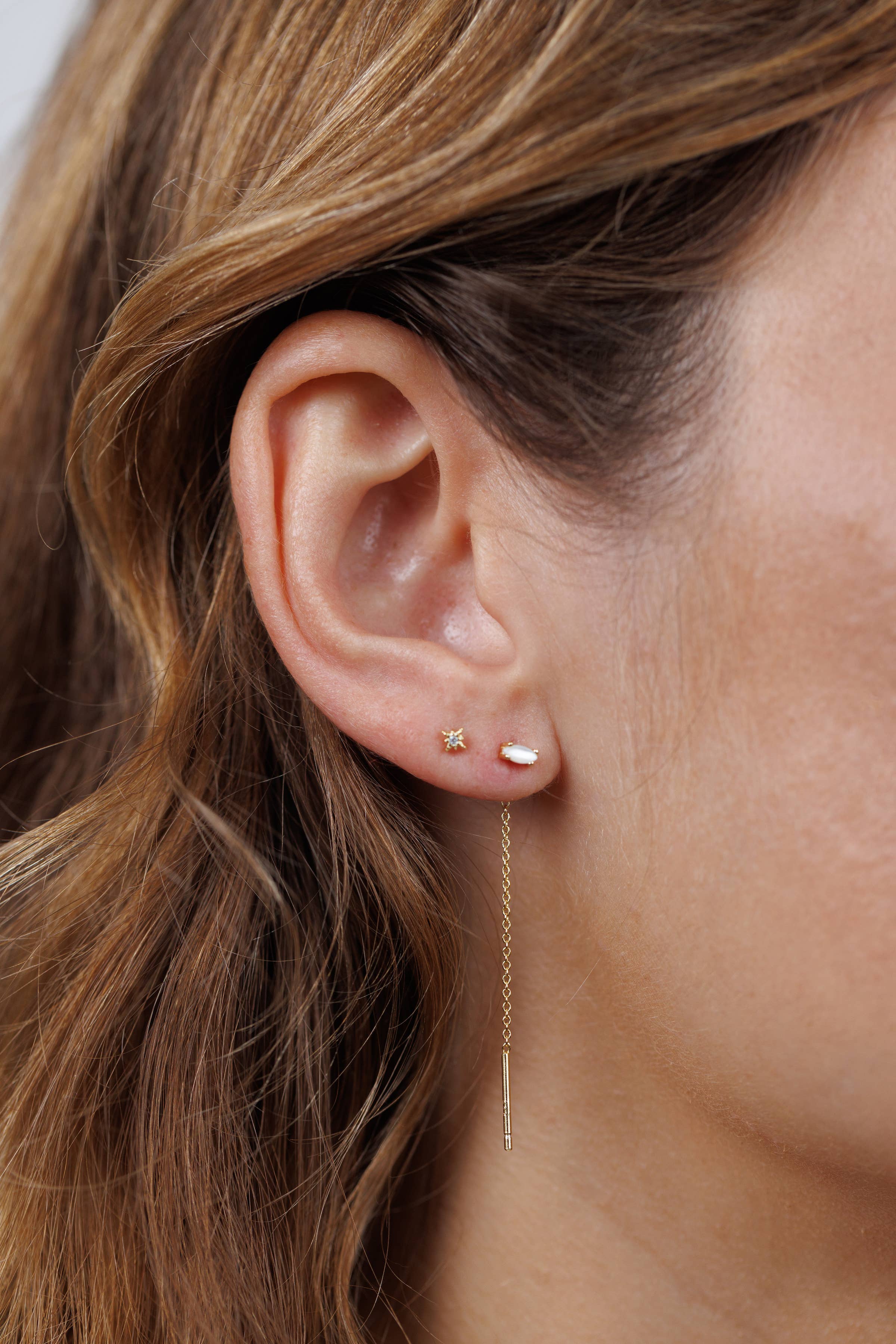 Adding a little charm to your daily aesthetic. These studded threaders have an oblong drop of mother of pearl set to anchor a sweeping thread of chain.